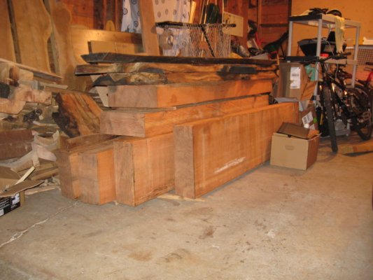 I spent several weekends surfacing two pieces of cherry crotch which will be the legs. Each leg measures 36″ across and 36″ tall, though they will sadly have to be cut down. Between the legs will be a set of drawers, in three or four banks. There will be about 9″ of space between the bottom of the bench top and the top of the drawers to serve as a shelf and allow work to be clamped to the bench top. At the end of the bench will be a twin-screw vise. On the front, there may be a shoulder vise or a patternmaker’s vise. I don’t see too much use in the front vise which is commonly seen on workbenches as they have a great tendency to rack. Four rows of holes will be bored in the bench top to accomodate bench dogs and hold-downs. A sliding deadman will be featured along the front of the bench to support wide stock when working on its edge. The height will be adjustable by slipping blocks under the feet.