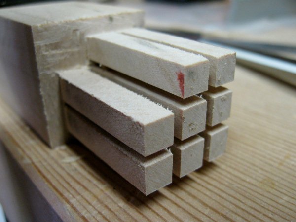 I started with 1-1/4″ square stock and cut them on the table saw. Using a thin-kerf blade, I made a series of cuts to form nine tenons. I intentionally set the blade a shade deeper than 1-1/4″ so that the tenons would protrude slightly from the mortises, making it easy to trim them flush after glue-up.