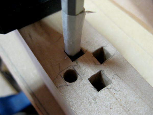 The next challenge, the harder part was to make matching mortises. I carefully positioned the tenons against the part to be mortised and transfered the locations with a marking knife. Then I moved to the drill press to drill out the majority of the waste before carefully squaring the mortises with a 1/8″ chisel, slowly sneaking up to the scribed line.