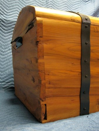 I bought some 1-1/2″ wide, 1/8″ steel strapping for the strap hardware and started by forming the knuckles for the hinges. I bent the straps to match the carved contours of the chest and the coopered top by hand, using a pair of dogs in my vise as fulcrums. It wasn’t difficult at all, but required a lot of testing. The handles were formed from 1-1/2″ angle iron. I bored holes to accept cut nails and spray painted them with four coats of black “hammered” paint.