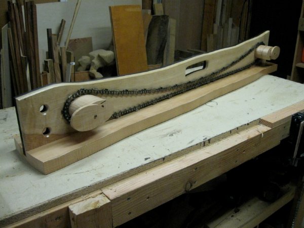 So when Dave asked me to make him a new chain rack, I immediately had some ideas. I started by adding a cutout at the midpoint of the body to carry the rack by, where it would also be balanced. I went from dowel posts to elliptical blocks with eccentric caps, which when rotated 180 degrees, prevent the chains from sliding off. I kept the hanging feature as an option, but added a base to allow the rack to stand on edge. This allows access to both sides of the rack. And to differentiate the sharp chains from the dull, I made the body of the rack from two pieces of maple – one which I had dyed dark brown and one left natural.