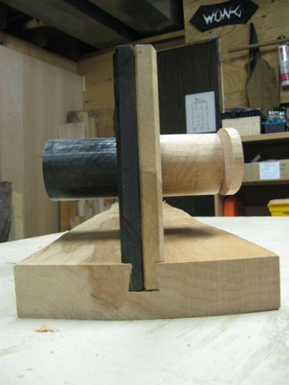 I joined the base to the body with a long sliding dovetail. I cut the slot in the base with a hand-held router and a straight edge, wasting away the bulk with a straight bit, then finishing up with a dovetail bit. I milled the male part on the body using my table-mounted router, testing frequently to get a good fit. In hindsight, I should have made it a tapered dovetail, but I didn’t think to at the time. So I kept trimming down the dovetail and testing the fit. When it fit well, I started putting it together. Well, I got it about 6″ in and it started to get tight. What I should have done was pull the joint apart and trim it down some more. But I figured, it’s fit this far, so why won’t it go all the way? So I beat on it. And I beat on it more. It must have sounded like a pile-driver to the neighbors. Eventually, I got it together. Nothing split. And there is certainly no need for glue. And it looks awesome and works well to boot!