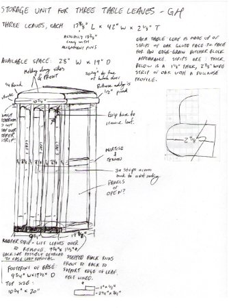 That gave me all the details I needed to design the Table Leaf Storage Unit. So I went home and drew up a set of plans. For most of my work, I don’t bother with drawings, plans, or cutting lists. But in this case, because it has to match the table and fit the leaves, the size is critical.