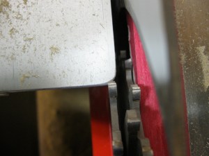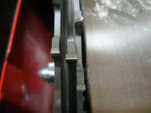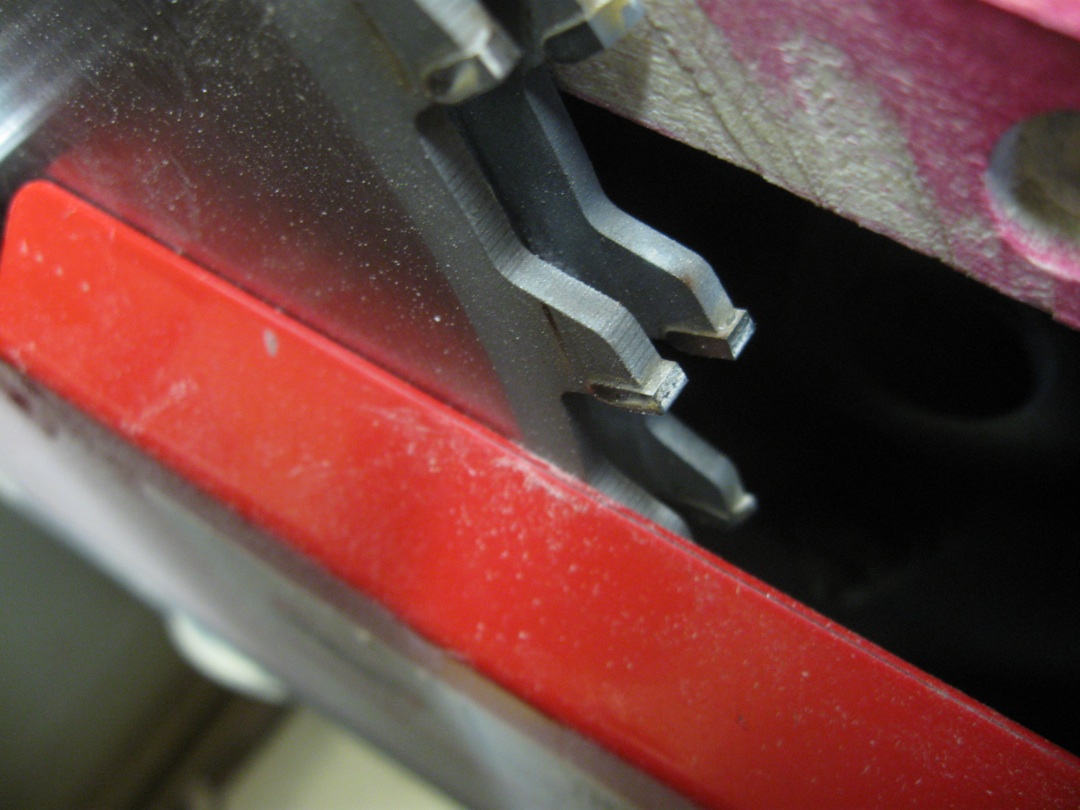 Installing the dado stack, I tried to be lazy and not remove the insert to the right side of the saw blade (a sliding table saw is quite different than other table saws in this regard) and found that I could put a 1/2″ dado stack on the arbor and get the arbor nut to thread on enough. I was happy about that, and proceeded to get ready for a test cut. However, when I closed the hinged blade cover, I found that it contacted the blade and the saw will not run if the cover is not closed. I could probably have rigged up something to trick the microswitch into thinking the cover was closed, but that wouldn’t be very safe. Furthermore, I soon realized that my sliding table wouldn’t clear the dado stack. Okay, Chris, stop being lazy – you’re wasting your time.