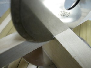I reinstalled the dado stack. I am always careful to position the teeth of one blade in the gullets (spaces between the teeth) of the adjacent ones. Doing this protects the brittle carbide teeth and ensures that the cutters stack properly. In order to set my dado stack to be precisely as wide as my stock is thick, I built the stack slightly undersize using the two outside blades and inside chippers, then inserted shims between the blades as well to intentionally make the stack too wide. Then I made a notch in a scrap and tested the fit of one of the strips that would be used for the core. As expected, the fit was loose. Here’s the trick: I then fit shims into the gap until I had a good fit. The width of the shims inserted represent what I needed to remove from the dado stack to get the perfect fit. In my case, a 0.020″ and 0.005″ shim filled the gap, so I needed to remove 0.025″ of shims from my dado stack. Thanks to my friend Charles for showing me this trick.