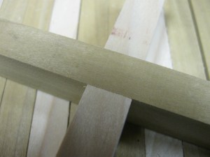Then it was a simple matter of cutting all the joints. I set the stop on my sliding table’s crosscut fence and gang-cut the strips six at a time. To assemble the core, I brought all the pieces to my workbench. Using a small scrap of wood and my deadblow mallet, I fit all the pieces together. They would go together with hand pressure, but the mallet makes it easier. The scrap of wood protects against damage and also helps ensure that all pieces are set as deep as their neighbors. Once they were put together, I checked them for square and flatness. To glue the joints together, I used Chair Doctor glue which has a viscosity similar to water. I simply added a healthy bead at each joint and let it wick down into the joint. After a few minutes, I flipped the core over and applied glue to the other side. This was much easier than knocking the joints apart, applying glue, then putting it all back together.
