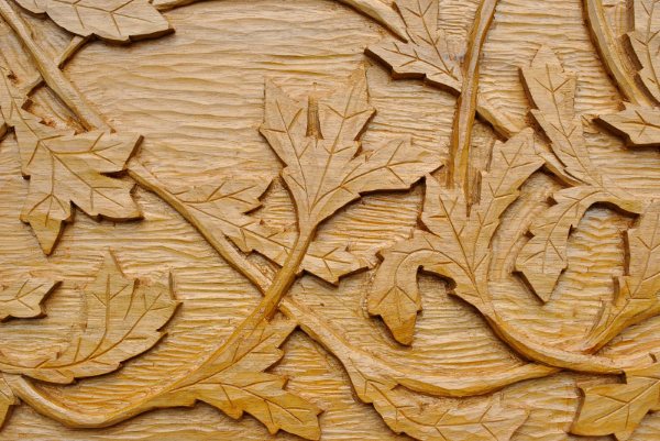 Minding the black lines, I routed away the bulk of the waste with a plunge router. From there, I proceeded to carve the background and further define the shape of the leaves and vines with my carving gouges. Lastly, I added shape to the leaves, making them curl and overlap each other. The layers give the carving the effect of depth. When the carving was complete, I gave it one coat of orange shellac before assembling the headboard.