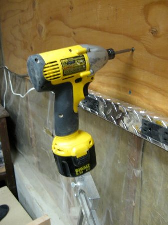 Then I would carefully release the impact driver and leave it suspended from the screw head. My left hand was still holding up the other side of the plywood. With my right hand, I then reached into the pouch on my belt for another screw and pressed the tip into the plywood where it would hang. Then, I would retrieve my driver from the first screw and drive the second.
