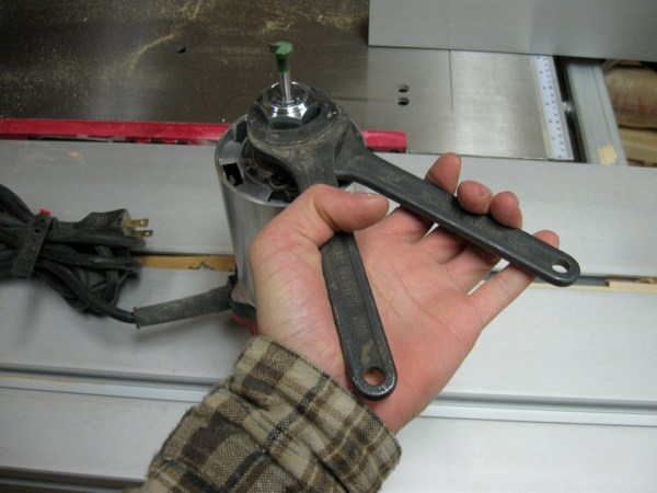 Let’s go back to the example of removing a bit. When we first need to use wrenches, we are unthreading the collet nut and separating it from the collet that remains firmly lodged in the router spindle due to the taper. Once we break the collet nut free, it can be turned by hand until the inside edge of the collet meets the V-shaped groove (or spring clip) around the edge of the collet. Then, wrenches are needed again to pull the collet out of the spindle. By the way, don’t bother to put the collet in the spindle without the collet nut as it is difficult to remove. Trust me on this. (There is absolutely no use for this except a photo-op).