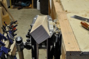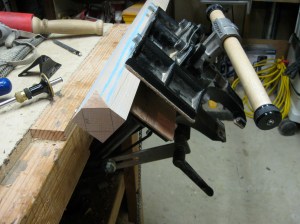 To ensure that the leg bottoms ended in a crisp, clean square, I first cut chamfers up to the layout lines. This project made good use of the Tucker vise’s tilt capabilities.