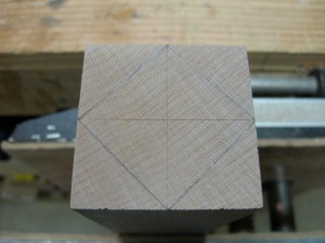 On the bottom of the legs I marked the midpoints of each face and connected the dots. A miter saddle square came in handy here. This diamond represented the bottom of the leg. Carving the twist automatically tapered the leg at the same time. Note that my leg blanks were riftsawn – the growth rings ran at approximately 45-degrees to the faces. This meant that each face exhibited straight grain. I didn’t want to see cathedral grain (arches) on these parts.