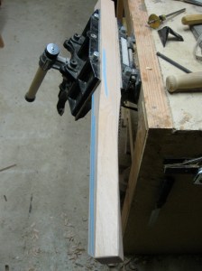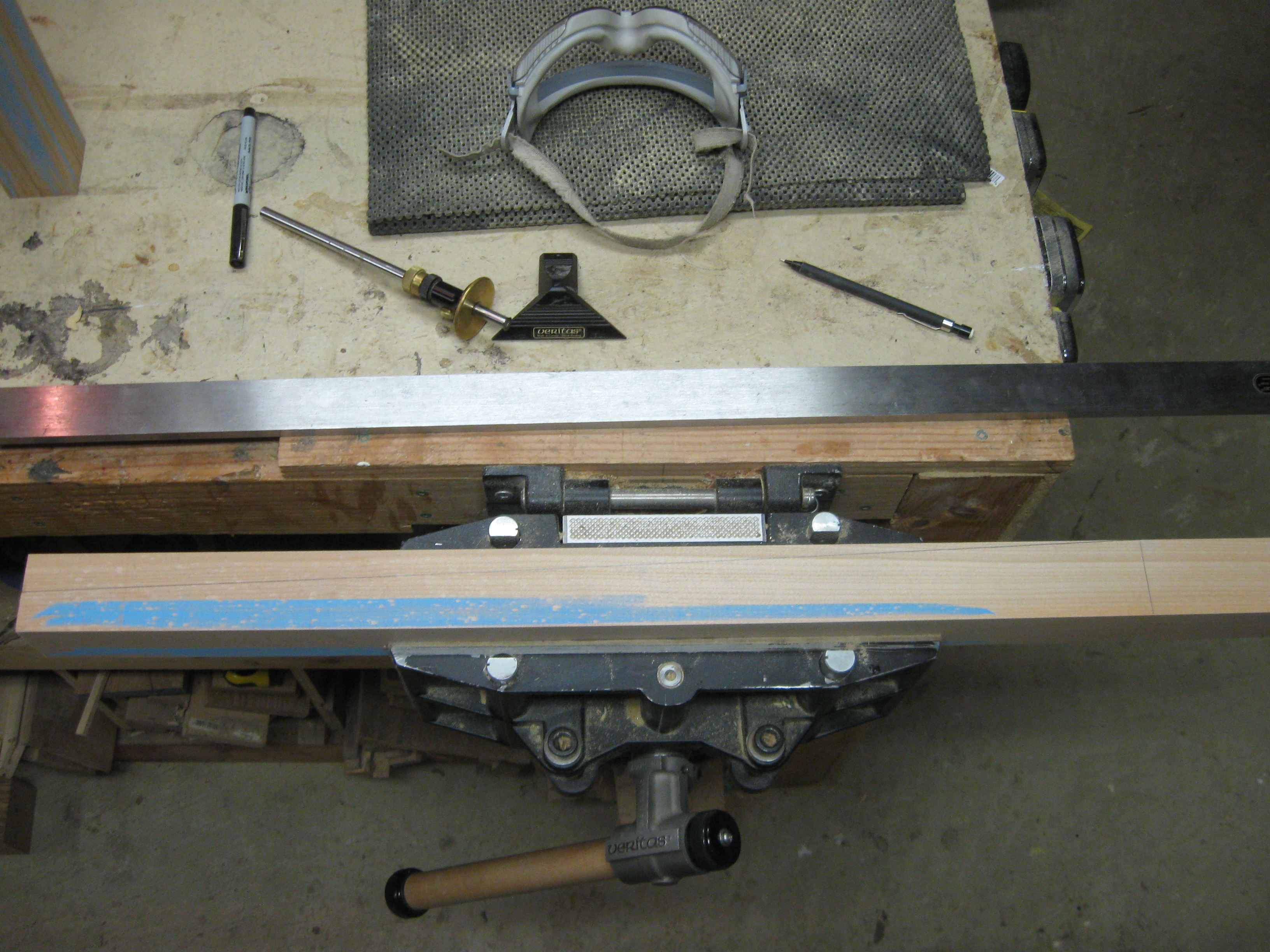 Then, being mindful of the blue chalk, I used a long straight edge to connect the corner at the top of the leg (where the twist starts) with the midpoint at the bottom of the leg. Note that the diagonal pencil line was drawn counter to the implied angle of the chalk. This was correct. I drew this line on all four sides of each leg, remembering that for two legs, the diagonal line would go the other way. (The leg in the picture below has a counterclockwise twist and the top of the leg is to the right of the picture. You can also see the marking tools I used sitting on the bench. I don’t remember why the fine-tip marker is there though…)