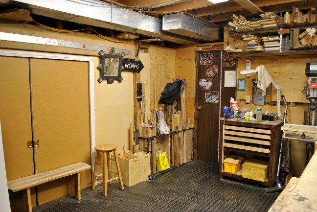 The two pocket doors at the left lead into an adjacent room that is used for many things, none of which are woodworking or wood storage. In that room, I do my photography and if I need the room to shoot a really big item, I can open the doors and shoot from inside the shop. Hung on the wall to the right of the doors are two projects from grade nine: a mirror and carved sign that reads “WONG”. Just below the sign is a black power bar and below that, an improvised rack for my narrow scraps longer than 2′; the longest scraps double as a coat rack. The yellow box on the bottom of the rack collects paper recycling.
