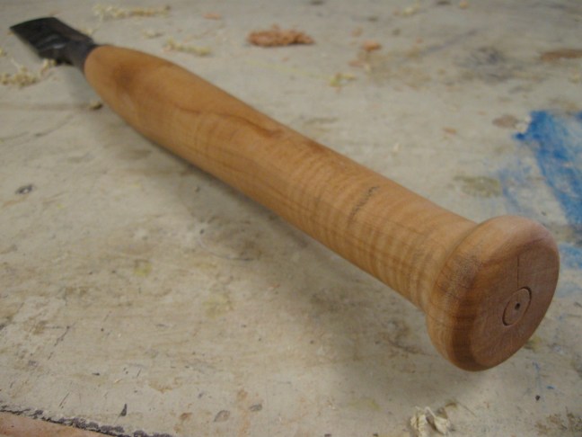 I knew that I liked to push chisels with my shoulder.  Even when I carved with a gouge like the one pictured at the bottom in the picture below, I used my shoulder to drive it.  For comfort, I wanted a large pad at the end of the slick’s handle to distribute pressure.  The scrap maple suitable for the handle was about 2″ square, so I made the pad that large in diameter.