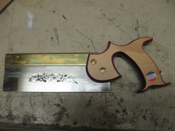 I bought this Lee Valley Dovetail Saw back in 2005 for $52.50. If you look closely and use a little imagination, you can read “Lee Valley” on the blade. The dovetail saw is made in France and has an 8″ blade with a traditional folded brass spine. (The Lee Valley part number is 33T0501, but the item is no longer listed on their website.)