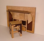 This piece merges wall art with furniture and takes collapsible furniture to a new level. A few folds and flips transform a picture of a desk into an actual working desk complete with a stool. When not needed, both the desk and stool disappear into the wall.