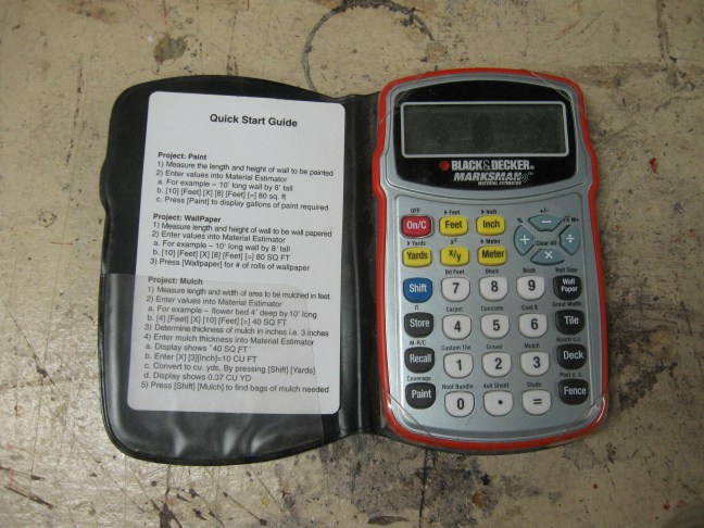 I bought this Black & Decker Marksman Material Estimator Calculator on impulse at the Black & Decker Factory Outlet. It worked fine until the battery died and I couldn’t be bothered to replace it.