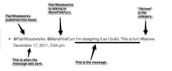 (If you are not familiar with the format used on Twitter, the @ symbol indicates a username. Every update, or “tweet” below starts with a username, being the author of that tweet. Sometimes, you will see two or more usernames in a tweet. The second (and third, etc) usernames are people to whom the author is talking. The other symbol you will see is #, which serves as a category. I tried to remember to categorize all my tweets pertaining to this project under #flairww.)