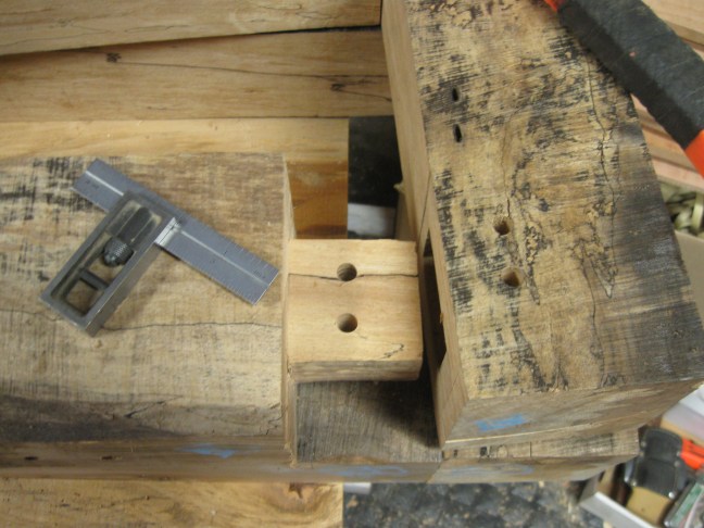 All the joints were drawbored mortise and tenons.  I used my drill press and chisels to cut the mortises and cut the tenons with my bandsaw and tuned them with my shoulder plane and chisels.