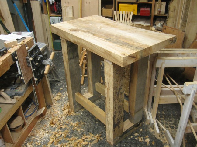 This small bench was built taller than normal (39.5″) to allow joinery to be cut at a more comfortable height – no more bending over to see your scribe lines.  I built the base using drawbored mortise and tenon joinery.  The bench was made of Western maple.