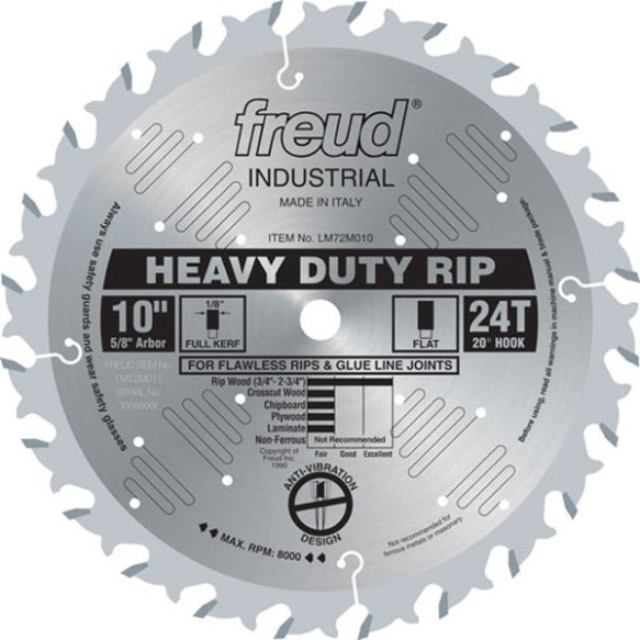 Freud’s 24-tooth Heavy Duty Rip Blade (LM72M010) is what is installed in my table saw 90% of the time. The blade has 24 teeth 0.126″ wide, ground flat on the top and pitched forwards at 20 degrees. These characteristics make it the most versatile and most used saw blade in my shop.