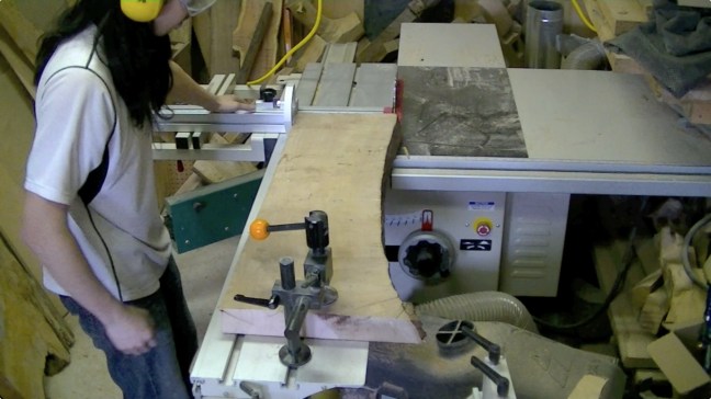 Once the stock was cut to length, I turned it length-wise to rip one edge straight.  I butted one end against the back of the crosscut fence and positioned a cam-action hold-down at the other end.  I positioned the workpiece where I thought it needed to be to rip a clean, straight edge (I could have also measured to be more accurate).  Then I secured the slab with the hold-down and pushed the sliding table and slab through the blade.  Because the slab wasn’t perfectly flat, I also applied downward pressure to the forward end.