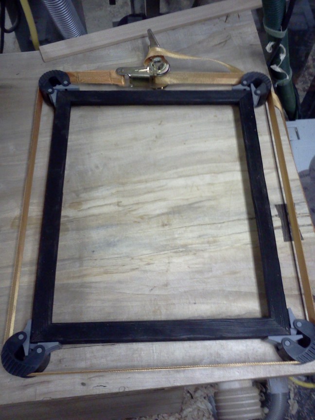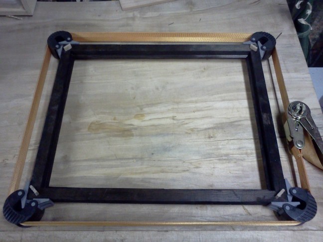 FlairWoodworks I’ve got the frame dry-fitted with a band clamp. All looks good so I’ll take it apart and apply the glue. #flairww -9:05 PM Jul 3rd, 2012