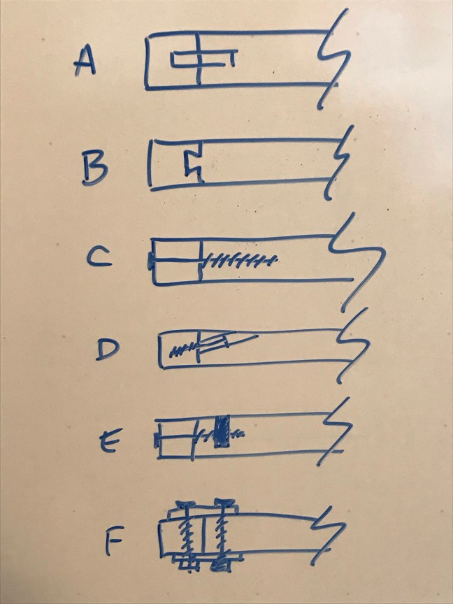 The last Example, F, shows two connecting plates attached to the table components with through bolts. This is a very strong connection. It’s also very conspicuous.