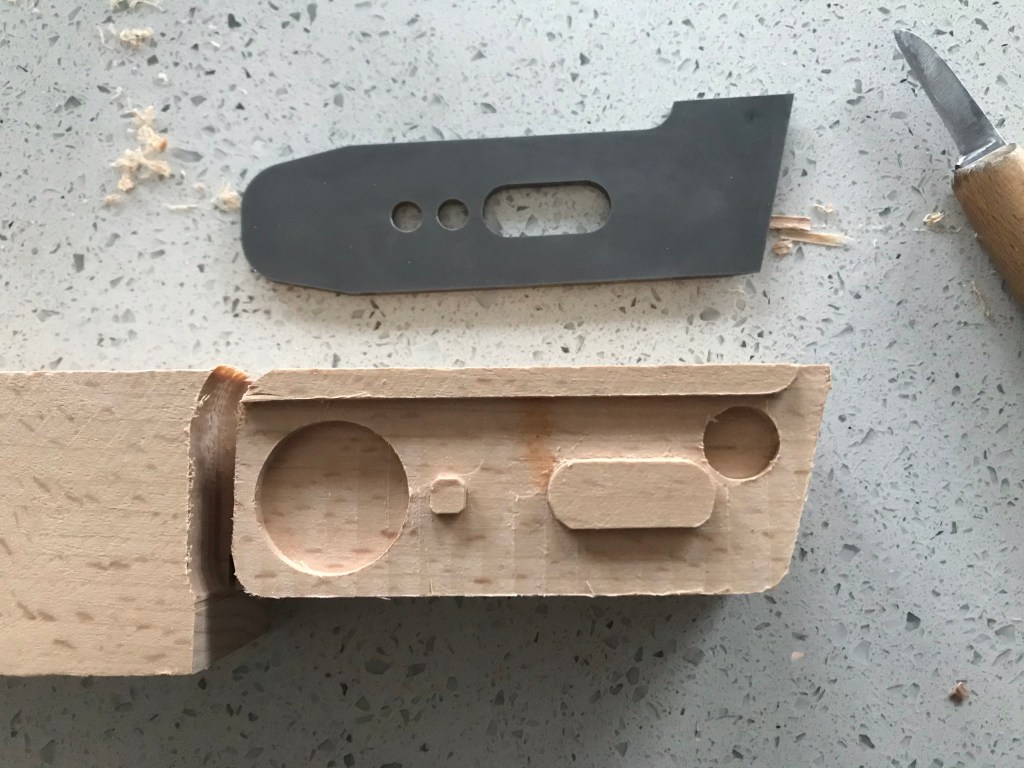 While I could have progressed to sanding, I chose to leave it with a mix of texture from the rasp and smooth facets from the carving gouges. Sanding may have made the plane body more aesthetically pleasing, but it was a tool for my own use and it would not function better with a sanded body. Besides, I could always sand it smooth later.