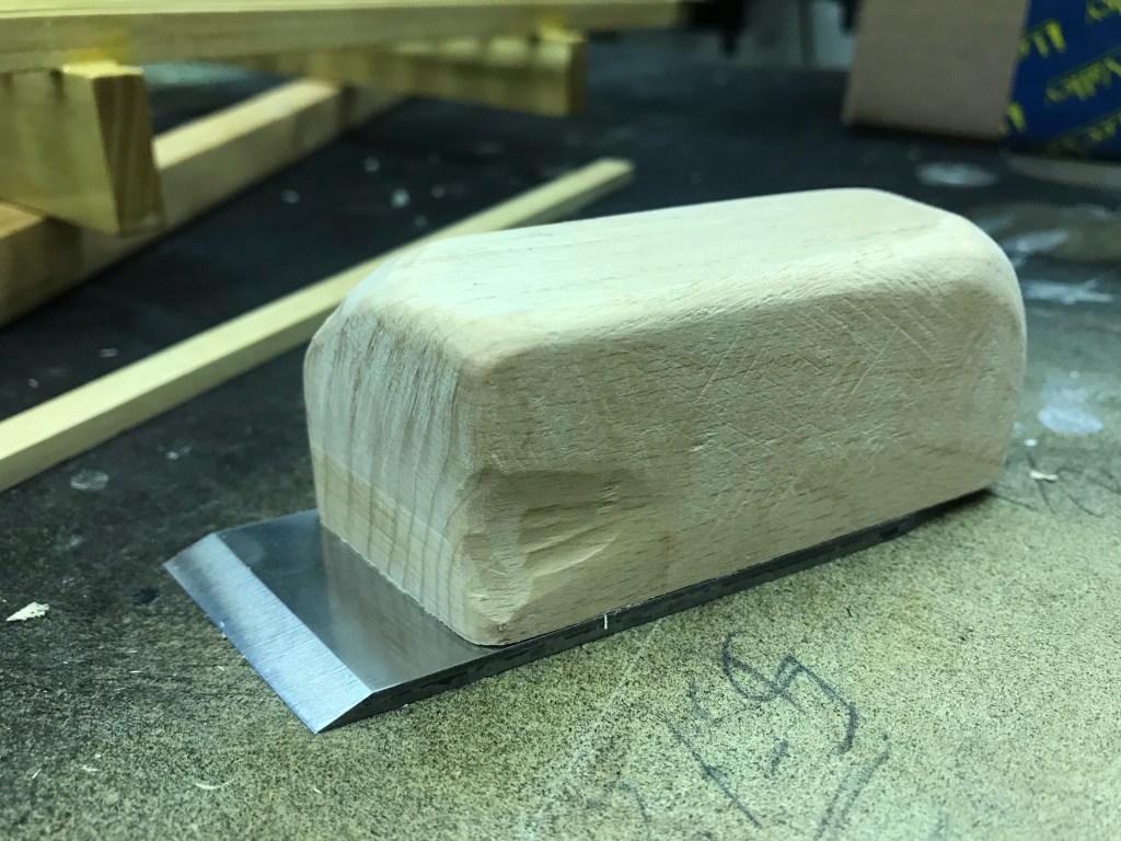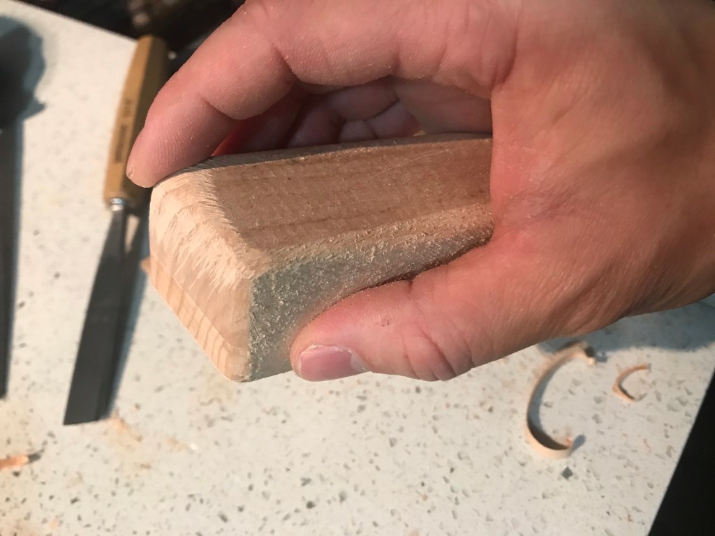 I separated the body and then the fun began – shaping. Using a coarse, hand-stitched half-round rasp and a few carving gouges, I gradually worked to shape the block to fit my hand.