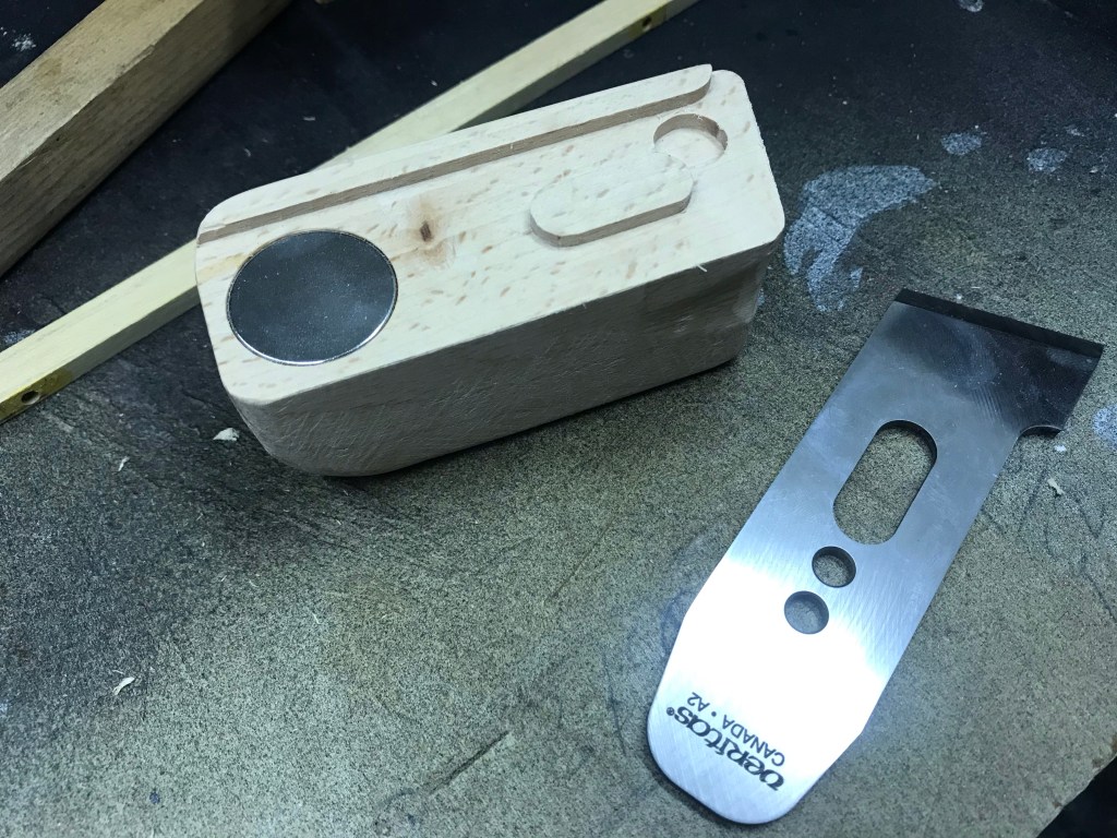 Looking through my selection of shorts, I found a beech 2” square that seemed ideal. I carefully laid out a profile to register the blade. I removed most of the waste with a router and fine-tuned the fit with a chisel and knife. I also bored two holes in the body to accept 1” and 1/2” rare earth magnet to attach the steel blade.