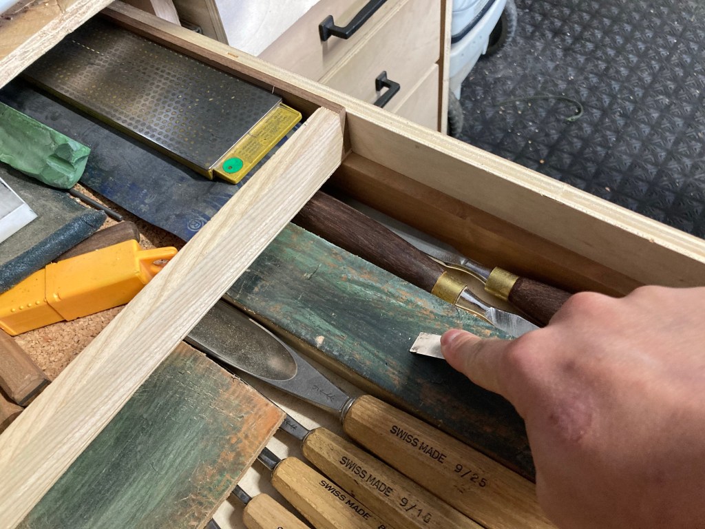 I’ll bet that you’re right. In addition to having tools always in the same location, getting to know tools by feel is also helpful. Carvers’ gouges are often easy to distinguish from each other by the shape or appearance of the handle, whether due to wear, custom shaping, paint or tape.