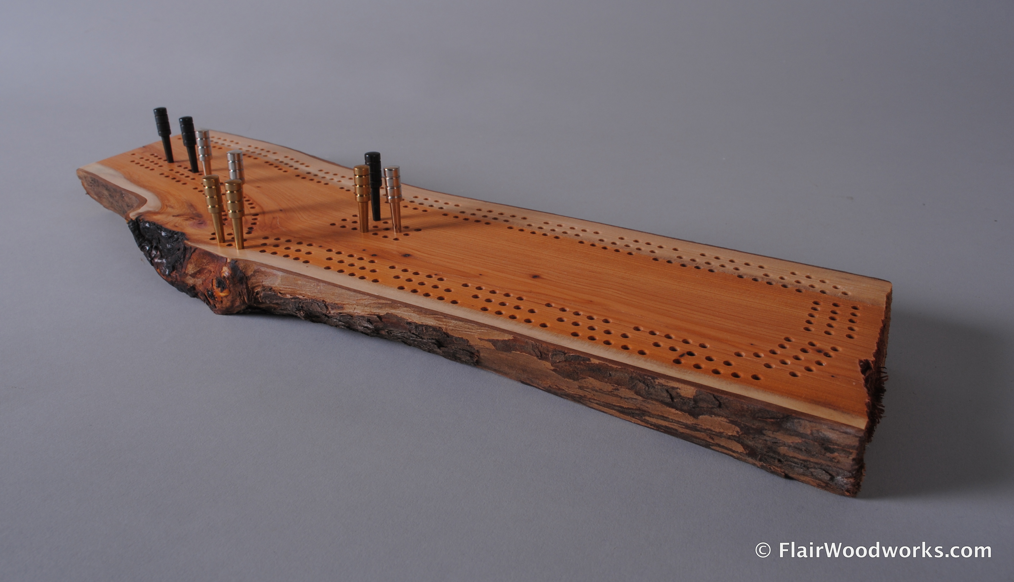 Title: Cribbage Board #11 Materials: Pacific Yew Dimensions: 15.5 x 4.5 x 1 inches (Length x Width x Height) Year of Completion: 2014 Details: Nine metal cribbage pegs are included.