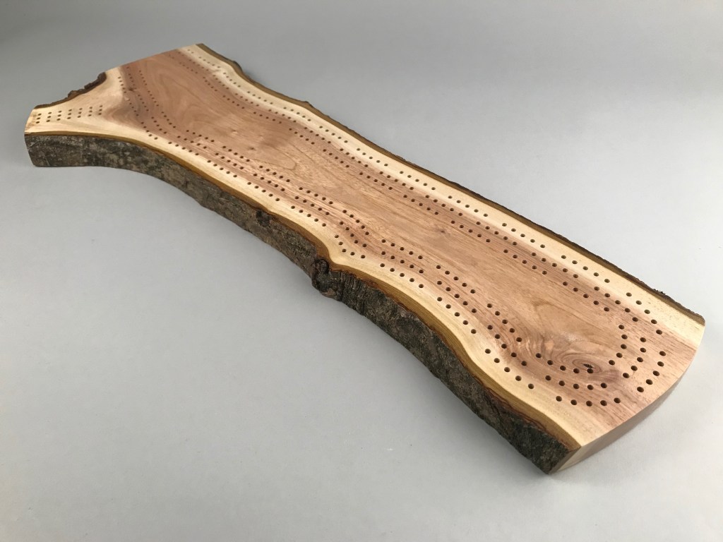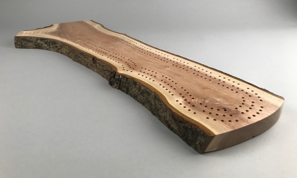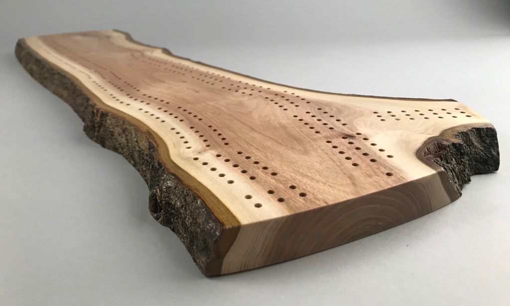 Grab a deck of cards and challenge your friends to a game of crib on this completely unique and one-of-a-kind cribbage board. This beautiful crib board features three meandering paths following the grain of the wood and a scoring field to keep track of wins.