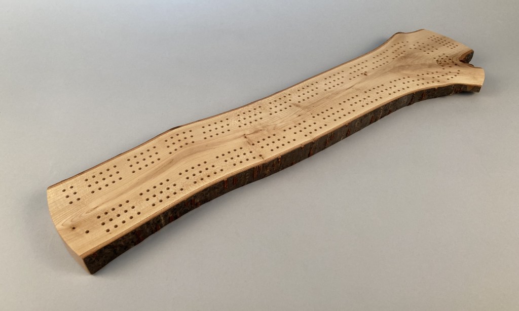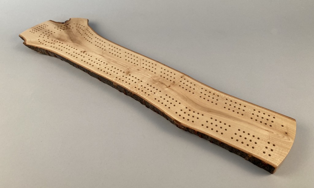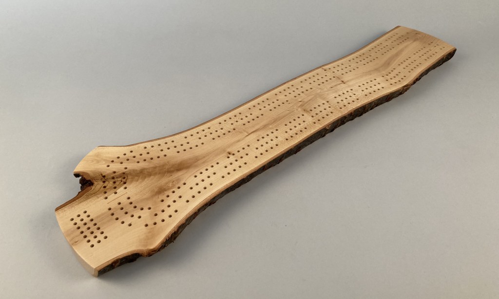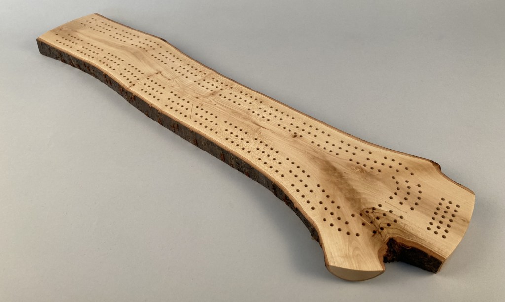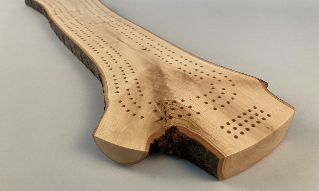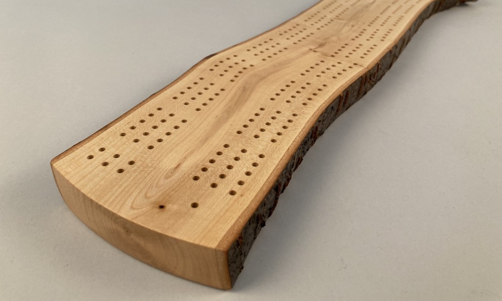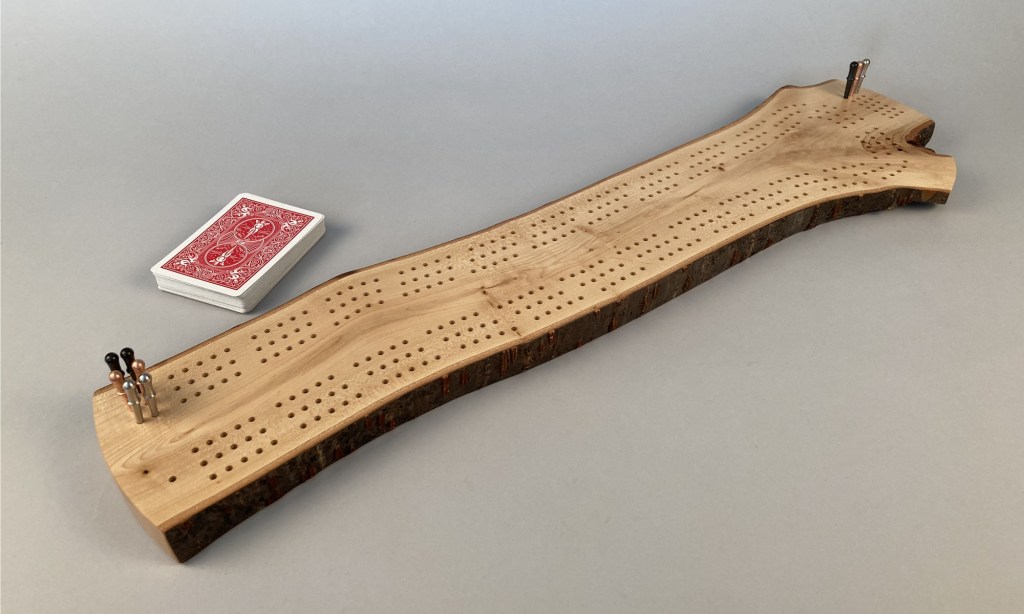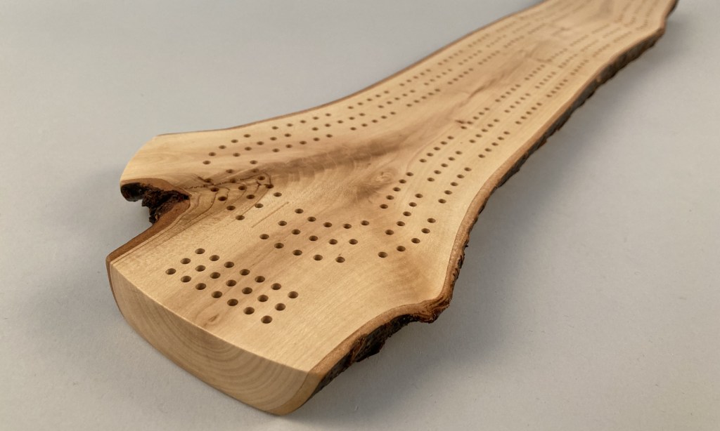 Grab a deck of cards and challenge your friends to a game of crib on this completely unique and one-of-a-kind cribbage board. This beautiful crib board features three meandering paths following the grain of the wood.