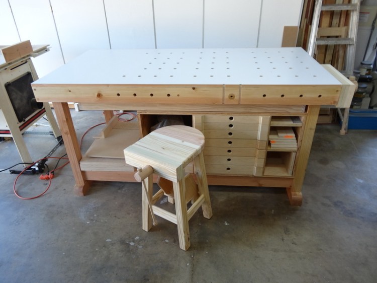 I made some bar stools more than 20 years ago that I still use in my house to this day and wanted to make something in the same style (height and foot rests are all at the perfect height for me). I also often have a need to work on something at a height lower than my workbench. For example, if I want to cut something with a hand saw I like to lean over it and secure it with my knee. I have a work mate, but that is just a little too high and too light/flimsy.
