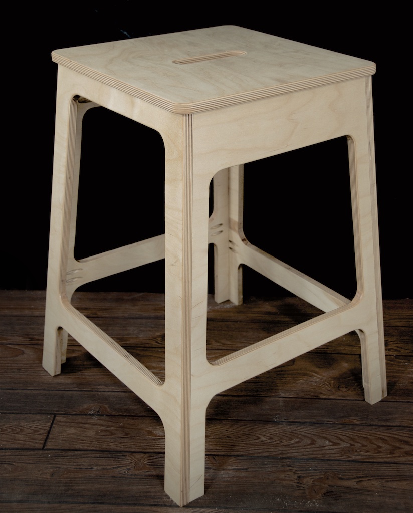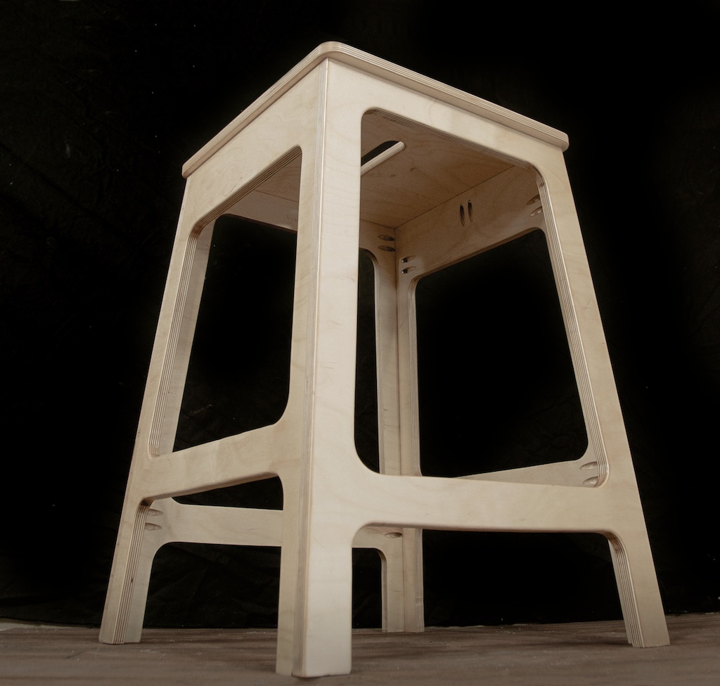 For my design I wanted to build something that’s repeatable and could also double as a bar stool. So I chose Baltic birch plywood for my material with the idea of being able to build the entire stool with just a half-sheet (4’x4′). To make it repeatable, I needed to first make templates for the front and sizes out of MDF and use a router with a pattern bit and cut out shapes. I purposely made the front/back stretchers a different height from the side stretchers for comfort options on where you can place your feet while sitting. For easy movement around the shop I cut out a hole that can be used as a handle.