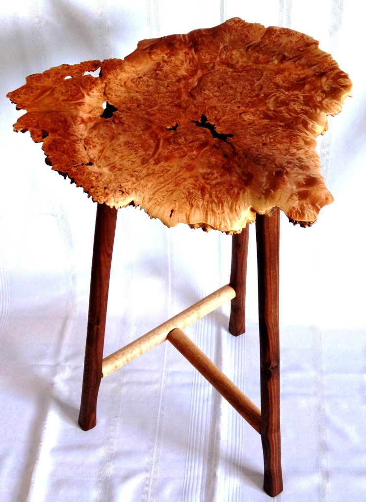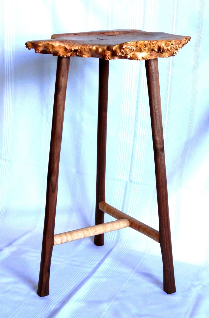 - Seat is a Maple Burl slab approx. 18″ wide, 16″ front to back, 2″ thick. Purchased in California approx. 30 yrs ago.